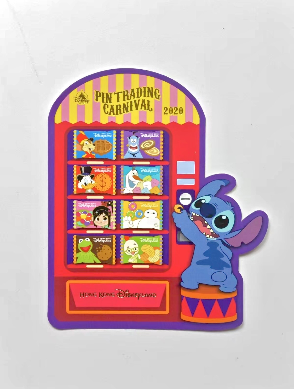 Limited Edition (LE) 600 pin set from HKDL Pin Trading Carnival 2020 - Snack Series pin series. It has 6 pins: Baymax, Chicken Little, Genie, Kermit, Olaf, Scrooge McDuck, Timothy Q. Mouse, and Vanellope. And a Stitch and vending machine backboard.